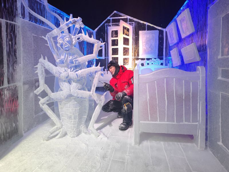 Ein weiteres Highlight ist die bewegliche Eisfigur, geschaffen im November 2024 von den Künstlern Karlis und Maija Ile aus Lettland. Diese beeindruckende Marionette aus Eis schwebt im Sternenhimmel der Eiswelt direkt neben der Eisbar – ein Paradebeispiel für die kreative Vielfalt, die die Eiswelt zu bieten hat.