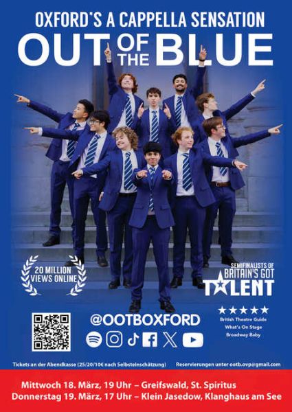 Zwölf Männer in blauen Anzügen bringen Pop a cappella auf den Punkt: bekannte Songs, präzise Arrangements und eine mitreißende Bühnenpräsenz. Frisch zurück von ihrer 15-Städte-Tour durch China sind Out of the Blue nun in Vorpommern zu hören. Mit Songs von Jon Bon Jovi bis Katy Perry, von den Backstreet Boys bis Olivia Rodrigo.