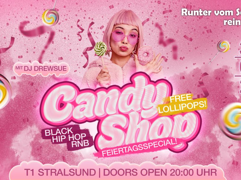 Willkommen im Candy Shop – süß, wild & voller Beats! Am 30. April verwandelt sich das T1 Stralsund in den heißesten Club der Stadt und wir tanzen zu Hip Hop, Black & RNB in den Feiertag.