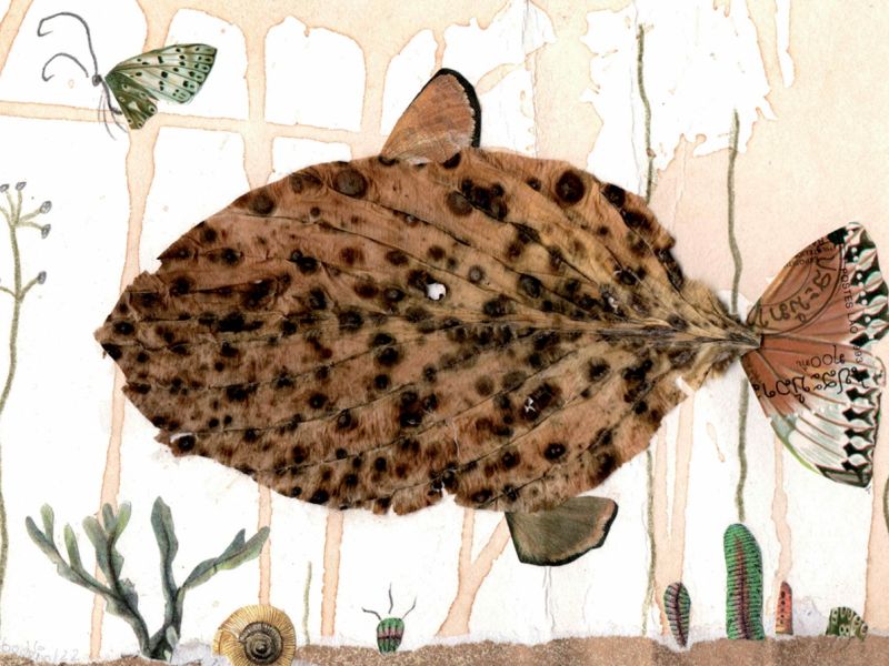 Gezeigt werden rund 50 maritime Papiercollagen und Illustrationen, bei denen die Künstlerin mit unterschiedlichsten Materialien wie alten Notenheften, handbedruckten Papieren, Abbildungen aus alten Naturtafeln, Siebdruckflächen, Acrylfarben und Buntstiften arbeitete. Häufig wurden auch Materialien aus der Natur, wie z.B. gepresste Blätter, verwendet, deren Form dann im Bild zum Fisch wird und so eine eigene, surrealistisch anmutende Welt entsteht. Heidrun Boddin wurde in Wustrow geboren und arbeitet seit vielen Jahren als Illustratorin und Dozentin für Illustration in Hamburg. Sie veröffentlichte zahlreiche Kinderbücher und Schulbuchillustrationen.