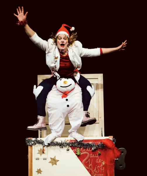 Eine große Kiste, ein Schlüssel zum Aufziehen, der Deckel hebt sich und das Theater beginnt. Mal steigt aus ihr ein Engel, mal ein Wichtel…und dann vielleicht sogar der Weihnachtsmann empor?