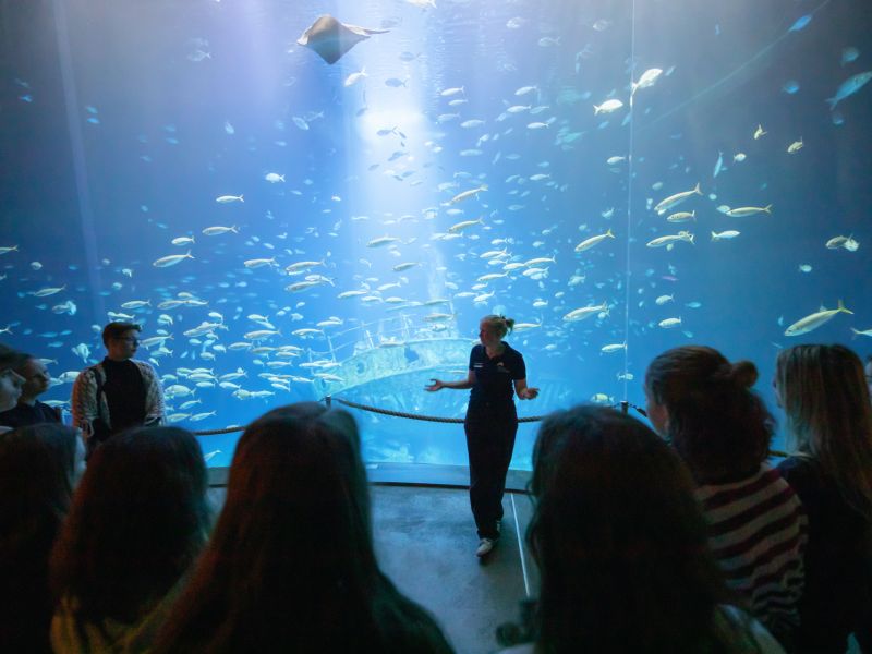 „Ab ins blaue Meer!“: Die Tour im OZEANEUM führt in die Unterwasserwelt der nördlichen Meere, vorbei an originalgroßen Wal-Modellen und vielfältigen Aquarien.