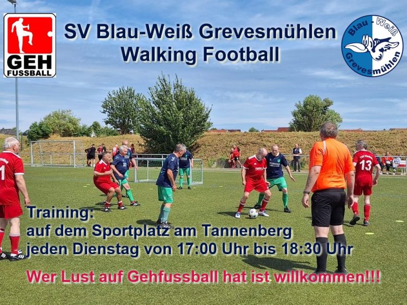Die Walking-Footballer des SV Blau-Weiß Grevesmühlen trainieren jeden Dienstag von 17:00 Uhr bis 19:00 Uhr auf dem Sportplatz am Tannenberg.