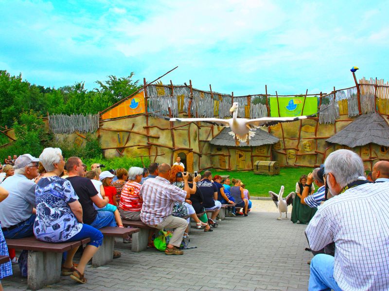 Durch das ganze Programm hindurch begleitet euch unser bunte Papageientrupp, welcher aus Dunkelroten Aras, Gelbbrustaras und Soldatenaras besteht. Im Freiflug präsentiert der Aratrupp sehr schön den unverwechselbaren Formationsflug der Papageien. Nicht so bunt, aber dafür mit einer ordentlichen Flügelspannweite kommen unsere Marabus und das Pelikanquartett daher. Geht zusammen mit den Tiertrainern und unseren tierischen Stars auf eine bunte und unterhaltsame Reise um die Welt.
