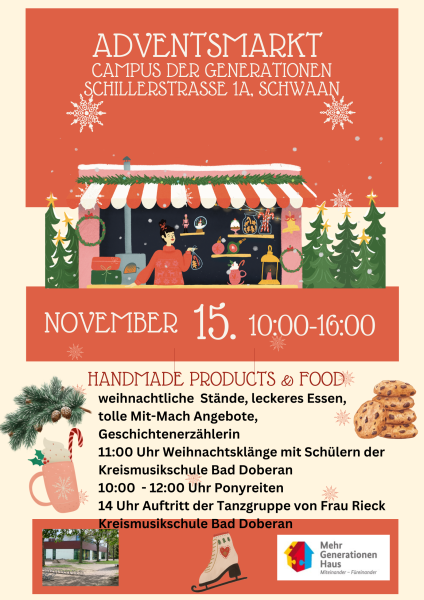 We invite you to this year's Advent market on November 15. Creative people will be offering beautiful handmade items for sale. In the morning, ponies will be at the house for the horse-loving children. You will hear Christmas sounds from the pupils of the district music school. In the afternoon, the children of Mrs. Rieck's dance group dance to hot rhythms on the stage. The Offener Treff bistro will cater for your physical well-being with coffee, cake and hearty dishes.