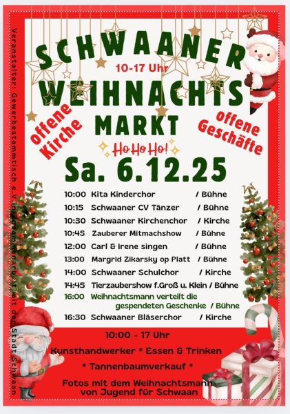 Schwaan Christmas market on December 6, 2025! From 10 a.m. to 5 p.m., Schwaan's city center will be transformed into a festive Christmas paradise! Look forward to a colorful stage program with choirs, dancers, magic shows, music and, of course, a visit from Santa Claus, who will distribute the donated gifts at 4 pm 🎅. In addition to arts and crafts, delicious food and drinks, there is also a Christmas tree sale and photos with Santa Claus. The church is open and many stores invite you to browse. Come along and enjoy an atmospheric Advent day in Schwaan!