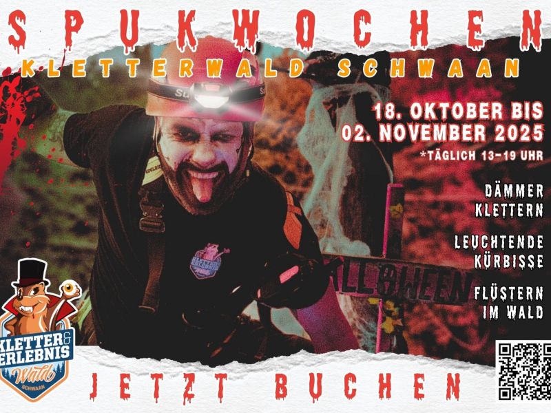 The Schwaan climbing forest becomes a ghost train! Glowing pumpkins, whispering trees and climbing in the twilight create a goosebump atmosphere from 18.10.-02.11. Vacation climbing during the day, twilight climbing in the evening: Just you, the forest - and what lurks there...