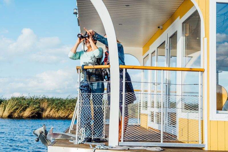 Mit dem Motorkatamaran sind Sie flüsterleise unterwegs. Das Hybrid-Schiff wurde in der zum Unternehmen gehörenden Bootswerft Anklam von erfahrenen Ingenieuren und Bootsbauern gebaut. Neben der Beobachtungsplattform gibt es einen gemütlichen Salon mit großen Panoramafenstern.