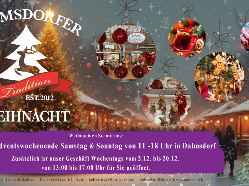 Wenn sich die Glasmanufaktur Dalmsdorf in warmes Lichterglanz hüllt, leise Weihnachtsmusik durch die klare Winterluft schwebt und der Duft von Glühwein und Tannengrün die Sinne begleitet, beginnt sie wieder: die Dalmsdorfer Weihnacht.
