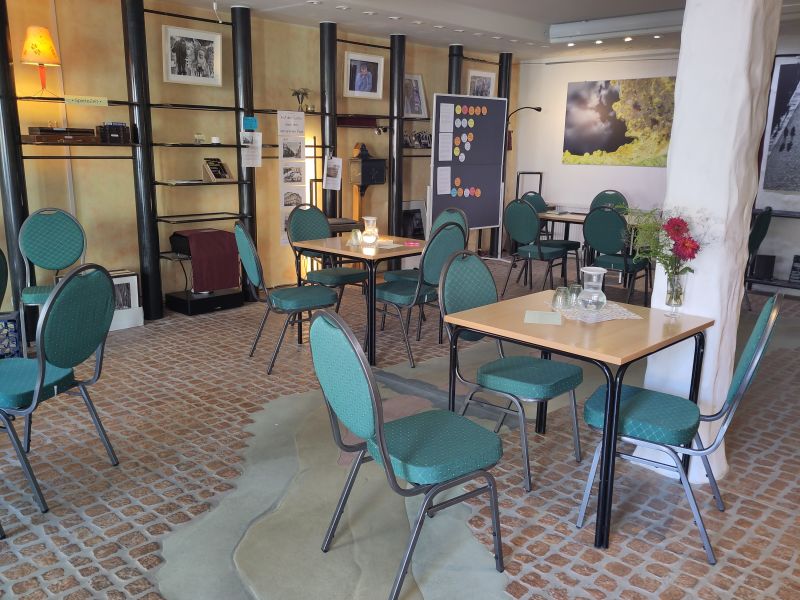 Kunst-Ausstellung, Kaffee u.a. Getränke, Bücher zum Lesen und Mitnehmen, WLAN, Kinderspielecke, Brett- und Kartenspiele. Kommen Sie einfach vorbei, treffen Sie sich mit Freundinnen oder Nachbarn zum Kaffee oder Backgammon-Spiel, oder nehmen ganz in Ruhe in unserer Leseecke ein Buch aus dem Regal und lesen - ohne Konsumzwang.