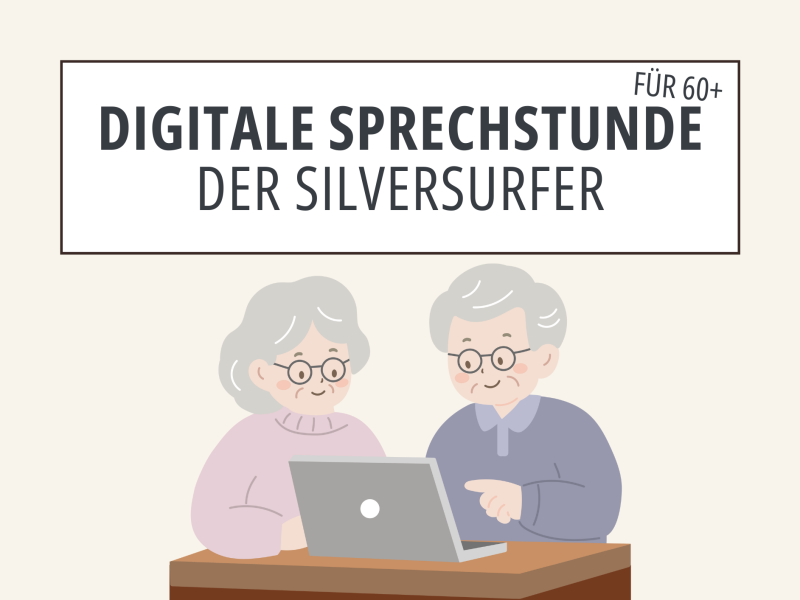 The Silver Surfer (Network 60plus) digital consultation hour takes place every 3rd Thursday of the month from 11:00 to 12:00. Among other things, questions about smartphones, tablets or PCs are answered and support is offered with their operation. The consultation hour is aimed at all interested people aged 60 and over, regardless of their previous knowledge.