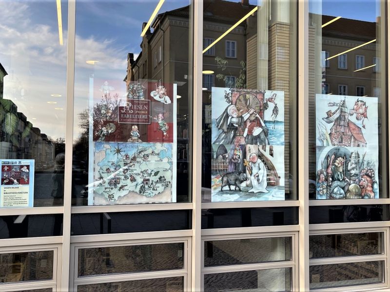 In keeping with the "fairy tale and legend season" around Christmas and the turn of the year, the Neubrandenburg Regional Library is presenting a small exhibition of colorful "book treasures" on the subject of fairy tales and legends until the New Year: historical editions from the library collections, which complement the wide range of books on loan with publications from four centuries of cultural history and regional history. In addition, fairy tale and legend illustrations light up the library windows around the clock: Fairy tale pictures of German folk tales by Johanna Beckmann (1868-1941) and - in cooperation with the Mecklenburg Foundation - legend pictures from the children's book "Riesen, Zwerge, Fabeltiere - Sagen aus Mecklenburg für Kinder" by Hartmut Schmied, illustrated by Andrea Sommerfeld, published by the Mecklenburg Foundation (2023). A great suggestion for telling fairy tales and legends as a family right now! By the way, those who take part are actively keeping intangible UNESCO cultural heritage alive: "Fairy tale telling" has been a UNESCO cultural heritage site since 2016 and "Legend telling in Mecklenburg-Vorpommern" was added to the nationwide list of intangible cultural heritage in Germany in 2021.