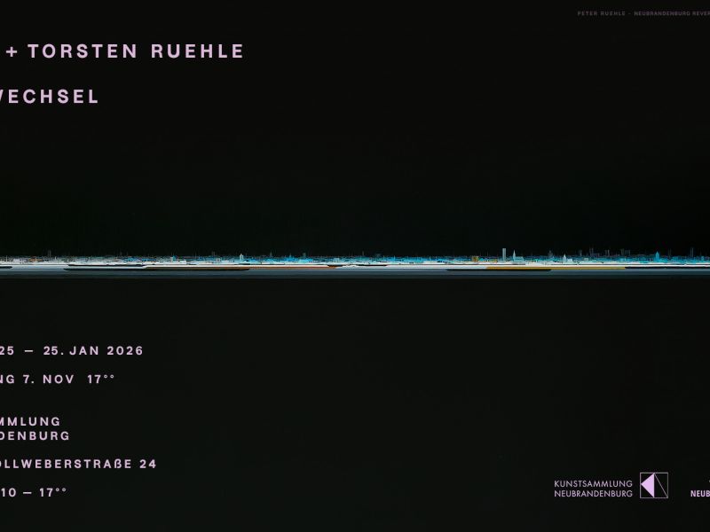 Peter Ruehle's pictures open up old conventions in landscape painting. His mostly monochrome scenes are conceptual structures that merge with perception through lines. A bold horizon cuts through the panorama and creates expanse and even sublime distance. Linear patterns create tension between geometric abstraction and atmospheric forms - metaphysical spaces unfold, as it were. In one of his latest paintings, Peter Ruehle transforms the view of Neubrandenburg into a never-before-seen and luminous urban space on a black background.